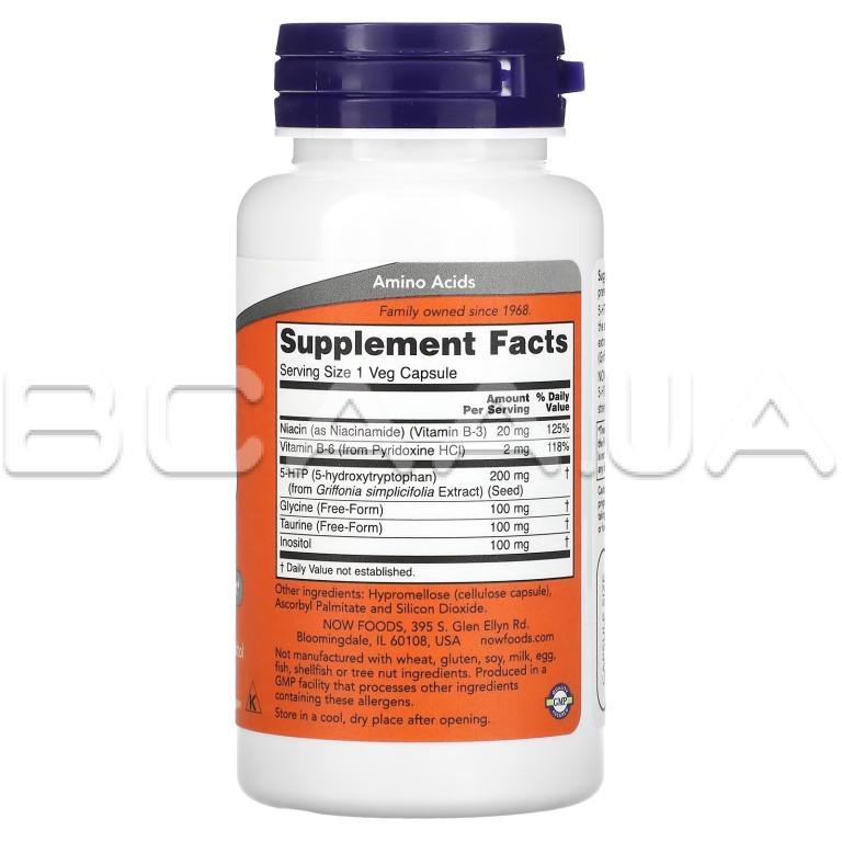 - Now Foods, 5-HTP 200 mg (5-гидрокситриптофан) – промежуточный метаболит между аминокислотой L-триптофан и серотонином, получаемый из семян африканского растения Гриффонии простолистной.