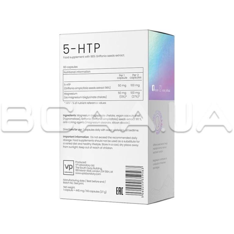 - VP Laboratory, 5-HTP сочетает в себе 5-гидрокситриптофан (5-HTP) из семян гриффонии простолистной (Griffonia simplicifolia) и магний, создавая синергетический эффект, способствующий эмоциональному балансу, расслаблению и качественному сну. 5-HTP стимулирует выработку серотонина, регулирующего настроение и сон, а магний способствует спокойствию, снижению усталости и укреплению нервной системы.