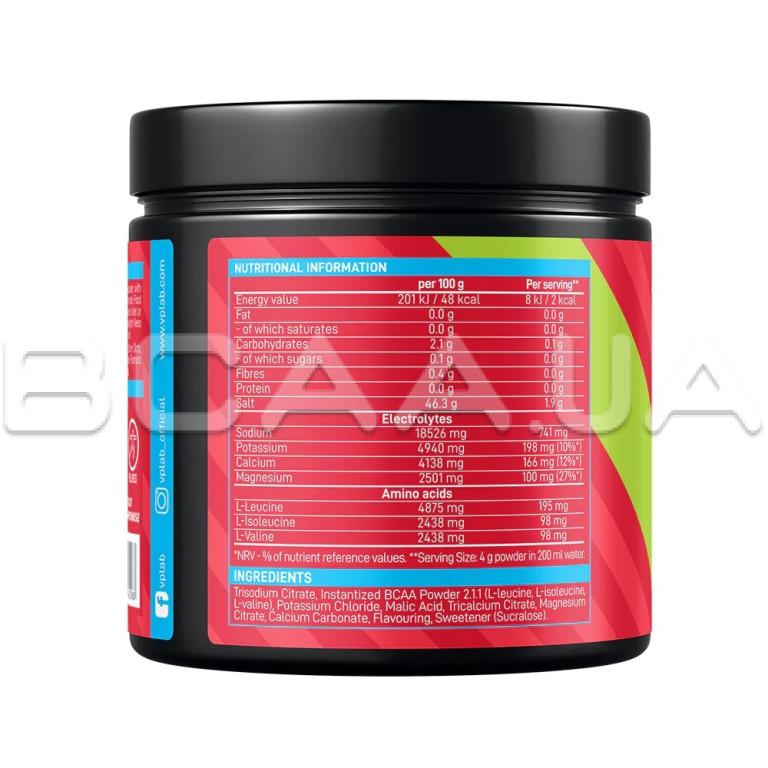 Ингредиенты: цитрат натрия, быстрорастворимый порошок BCAA 2:1:1 (L-лейцин, L-изолейцин, L-валин), хлорид калия, яблочная кислота, цитрат трикальция, цитрат магния, карбонат кальция, ароматизатор, подсластитель (сукралоза).