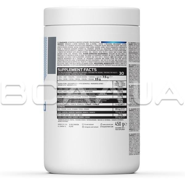 Другие ингредиенты: Аминокислоты с разветвленной цепью BCAA (L-лейцин, L-валин, L-изолейцин, эмульгатор: лецитины), L-глютамин, магниевые соли лимонной кислоты (магния), L-цитруллина малат, регулятор кислотности: лимонная кислота; цитрат калия (калий), инулин, хлорид натрия (натрия, хлорид), ароматизатор, концентрат свекольного сока в порошке, гидрохлорид пиридоксина (витамин В6), краситель: каротины; подсластители: сукралоза, ацесульфам К.