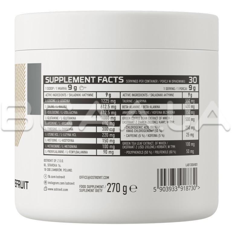 Ингредиенты: Растворимые BCAA (L-лейцин, L-валин, L-изолейцин, эмульгатор: лецитины), регулятор кислотности: лимонная кислота; L-глутамин, L-аргинин, таурин, экстракт зеленого кофе (Coffea Arabica L.) стандартизированный до 50% хлорогеновой кислоты и 5% кофеина, бета-аланин, L-тирозин, L-лизин HCL, L-гистидин, безводный кофеин, L-метионин, экстракт листьев зеленого чая (Camellia sinensis L.) стандартизированный до 50% полифенолов, L-фенилаланин, ароматизатор, подсластители: сукралоза, ацесульфам К.