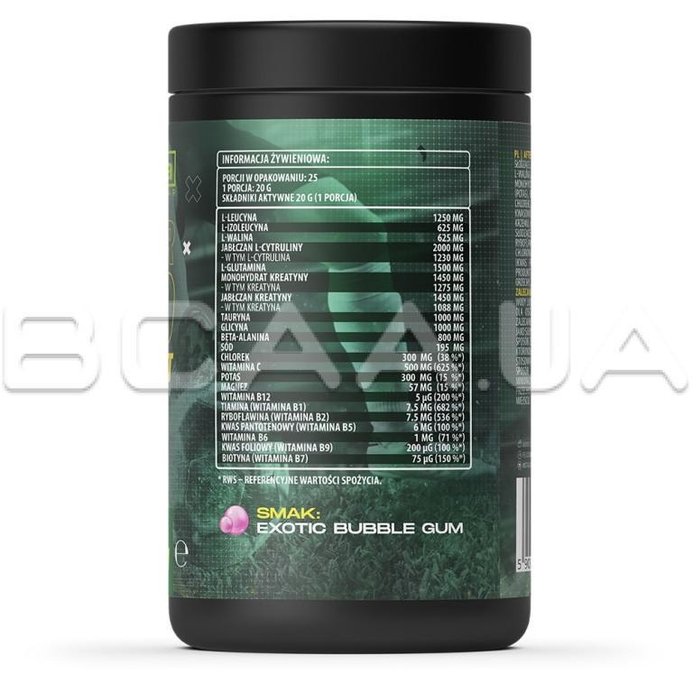 Ингредиенты: Мальтодекстрин, BCAA (L-лейцин, L-изолейцин, L-валин, эмульгатор: лецитины), L-цитруллина малат, L-глутамин, моногидрат креатина, малат креатина, таурин, глицин, цитрат калия (калий), бета-аланин, L-аскорбиновая кислота (витамин С), хлорид натрия (натрия, хлорид), магниевые соли лимонной кислоты (магний), ароматизаторы, регулятор кислотности: лимонная кислота; антислеживатель: диоксид кремния; порошок концентрата свекольного сока, цвет: каротины; подсластители: сукралоза, ацесульфам К; тиамина гидрохлорид (тиамин), рибофлавин (витамин В2), D-пантотенат кальция (пантотеновая кислота), пиридоксина гидрохлорид (витамин В6), птероилмоноглутаминовая кислота (фолиевая кислота), D-биотин (биотин), метилкобаламин (витамин В12). Содержит подсластители.