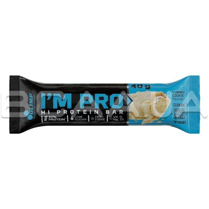- Olimp Labs, I'm Pro Hi Protein Bar - высокопротеиновый батончик (32% белка), покрытый белым шоколадом и хрустящими кусочками с добавлением витамина D, магния и цинка и клетчаткой.