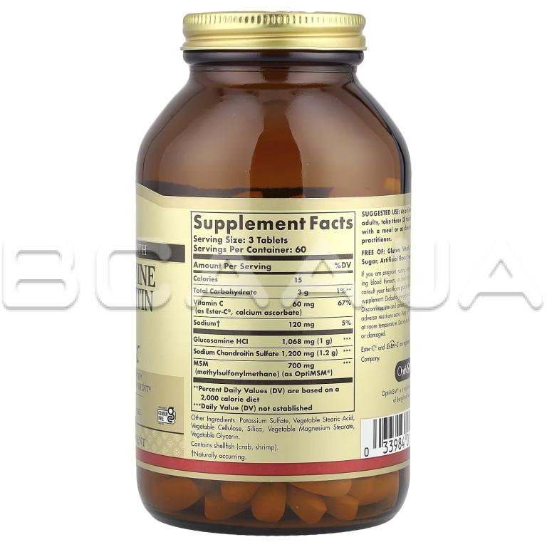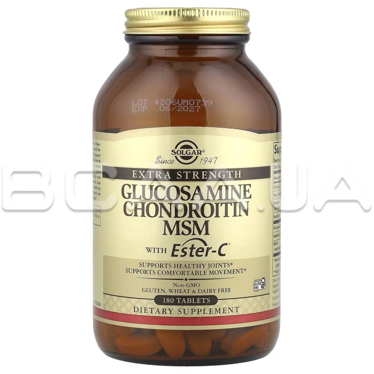 - Solgar, Glucosamine Chondroitin MSM with Ester-C® — это премиальная формула для здоровья суставов, сочетающая глюкозамин, хондроитин, МСМ (метилсульфонилметан) и запатентованный витамин С Ester-C®. Эта синергетическая смесь способствует поддержанию здоровья хрящей, снижению скованности и стимулирует выработку коллагена для долгосрочного комфорта и подвижности суставов.