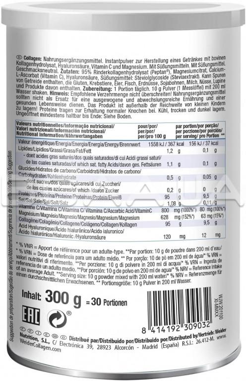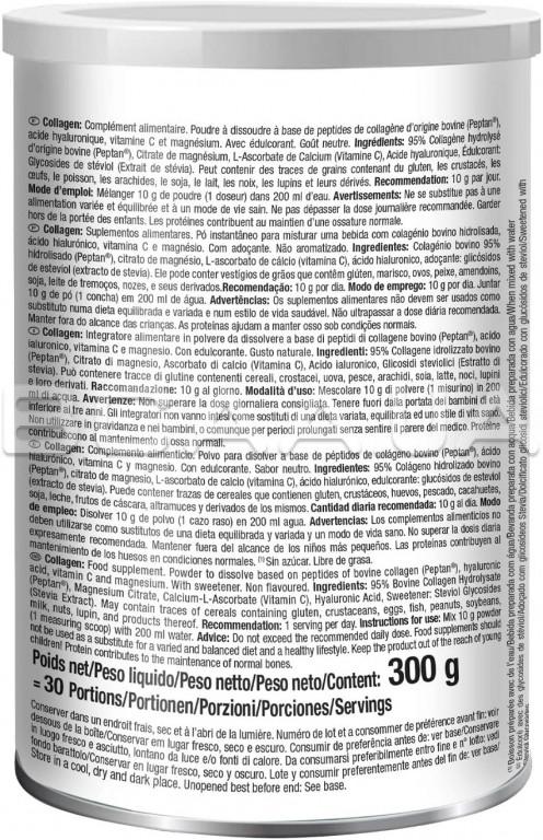 Другие ингредиенты: Бычий гидролизованные коллагеновые пептиды (100% Peptan®), цитрат магния, L-аскорбиновая кислота (витамин С), гиалуроновая кислота и подсластитель: экстракт стевии (стевиола гликозиды).