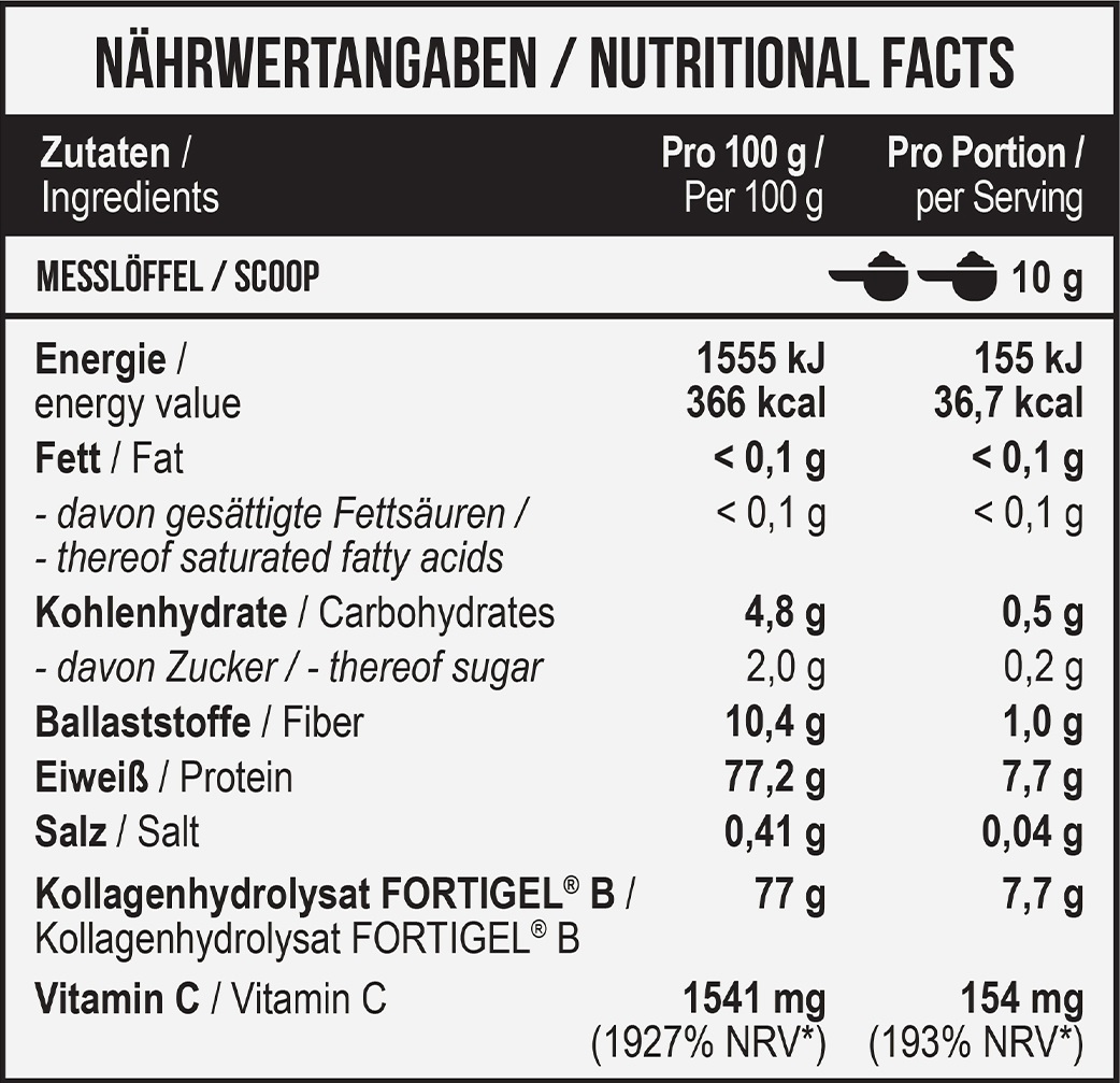 Ингредиенты: Гидролизованные коллагеновые пептиды (Fortigel®), витамин С (в виде L-аскорбиновой кислоты), инулин, лимонная кислота, натуральные ароматизаторы, сукралоза (подсластитель), красители.