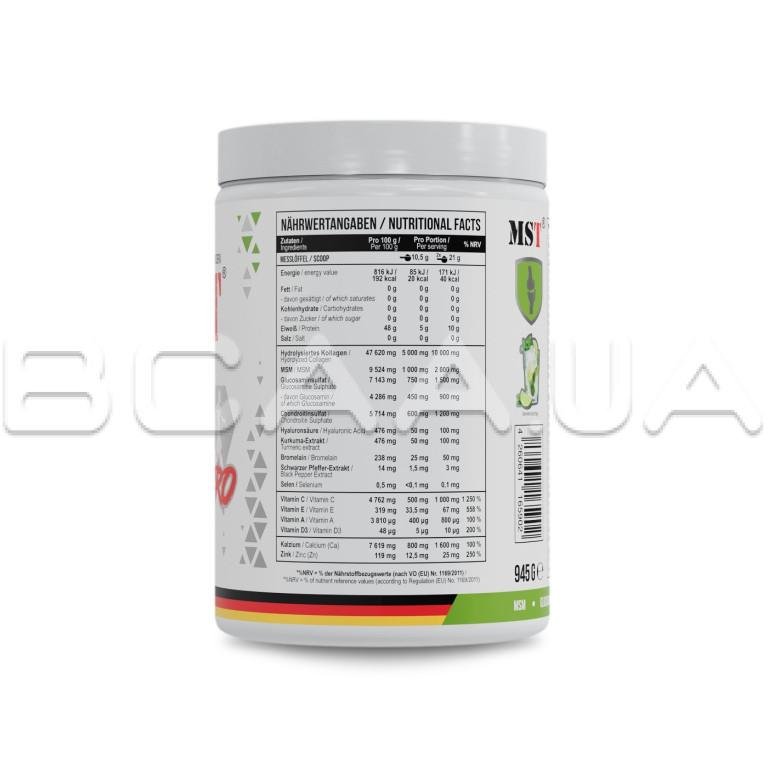 Ингредиенты: Гидролизованный коллаген (из говядины), мальтодекстрин, кальциевые соли ортофосфорной кислоты, метилсульфонилметан (MSM), сульфат глюкозамина (из моллюска), л-аскорбиновая кислота, кислота (лимонная кислота), хондроитинсульфат, пино дл-альфа-токоферилацетат, подсластители (сукралоза), экстракт корня куркумы (куркумин длинный) (стандартизированный до 95% куркумина), бромелайн (из ananas comosus 1200 гду/г), гиалуроновая кислота, оксид цинка, (бета-каротин, индигокармин), чёрный перец (piper nigrum) (25-35:1) экстракт (стандартизированный до 95% пиперина), натрий.