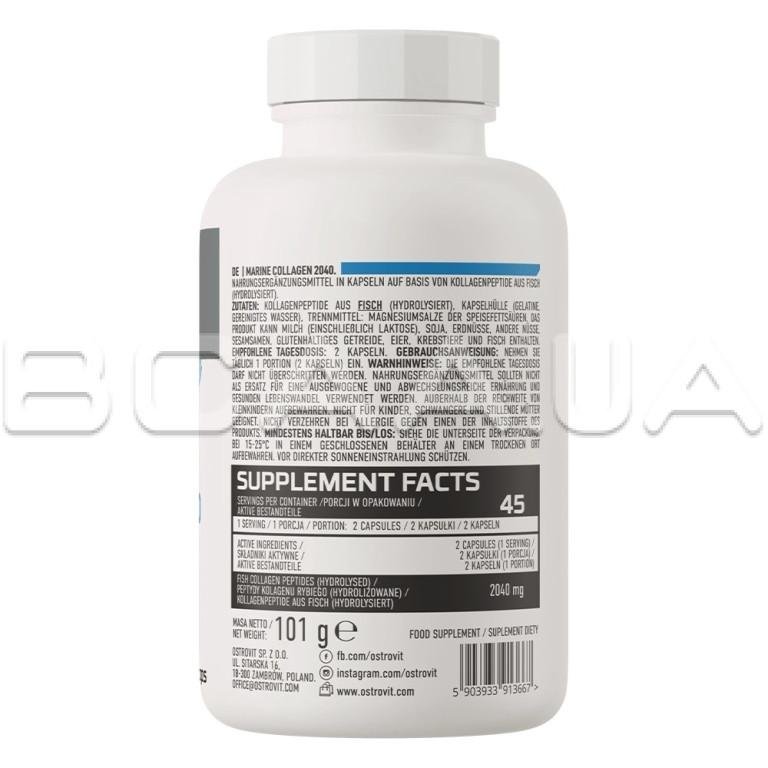 - Ostrovit, Marine Collagen 2040 mg — это высококачественная пищевая добавка, являющаяся источником ценного морского коллагена I типа, который хорошо усваивается организмом человека. Пищевая добавка доступна в виде легко проглатываемых капсул и подойдет как спортсменам, так и людям, ценящим здоровый и красивый внешний вид.