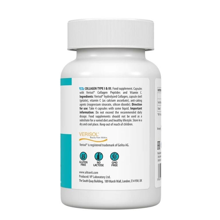Ингредиенты: гидролизованный коллаген Verisol®, оболочка капсулы (желатин), витамин С (в виде аскорбата кальция), антислеживатели (стеарат магния, диоксид кремния).