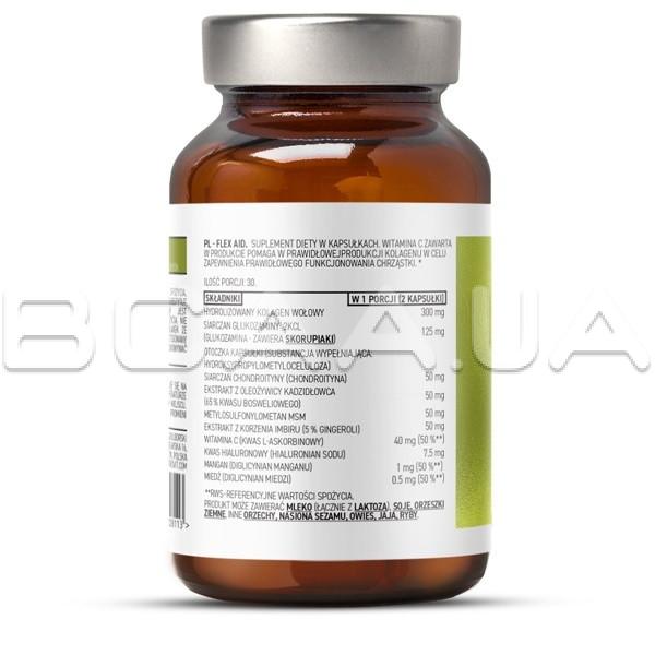 Другие ингредиенты: Гидролизованный бычий коллаген, глюкозамина сульфат 2KCL (глюкозамин - содержит ракообразных), оболочка капсулы (наполнитель: гидроксипропилметилцеллюлоза), хондроитинсульфат (хондроитин), экстракт олеорезина ладана (65% босвеллиевой кислоты), метилсульфониловый экстракт гингеролов, витамин С (L- аскорбиновая кислота), гиалуроновая кислота (гиалуронат натрия), марганец (диглицинат марганца), медь (диглицинат меди).