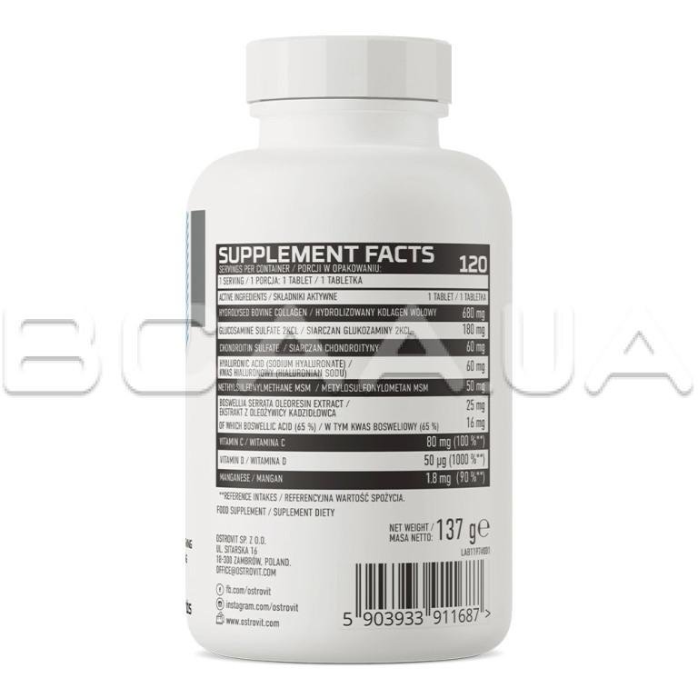 Другие ингредиенты: Гидролизованный бычий коллаген, глюкозамина сульфат 2KCL (содержит ракообразные), L-аскорбиновая кислота (витамин С), хондроитинсульфат, гиалуроновая кислота (гиалуронат натрия), метилсульфонилметан, экстракт олеорезина босвеллии пильчатой - 65% босвеллиевой кислоты, холекальциферол (витамин D), антислеживатели: кремния диоксид, магниевые соли лимонной кислоты; диглицинат марганца (марганец).