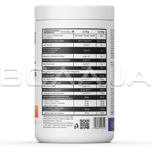 Ингредиенты: Глюкоза, хлорид натрия (натрий), кислота: лимонная кислота; ароматизаторы, тартрат L-карнитина, карбонат кальция (кальций), аминокислоты с разветвленной цепью BCAA (L-лейцин, L-изолейцин, L-валин), краситель: каротины; L-аскорбиновая кислота (витамин С), L-глутамин, цитрат магния (магний), цитрат калия (калий), концентрат порошка свеклы, подсластители: сукралоза, ацесульфам К; пиридоксин гидрохлорид (витамин В6).