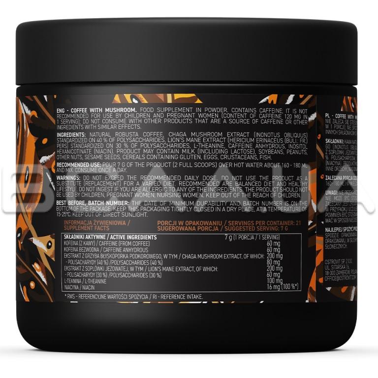 Ингредиенты: Натуральный кофе робуста, экстракт гриба чаги (Inonotus obliquus), стандартизированный по 40% полисахаридов, экстракт львиной гривы (Hericium erinaceus (BulI.: Fr.) Pers), стандартизированный по 30% полисахаридов, L-теанин, кофеин безводный, инозитол гексаникотинат (ниацин).