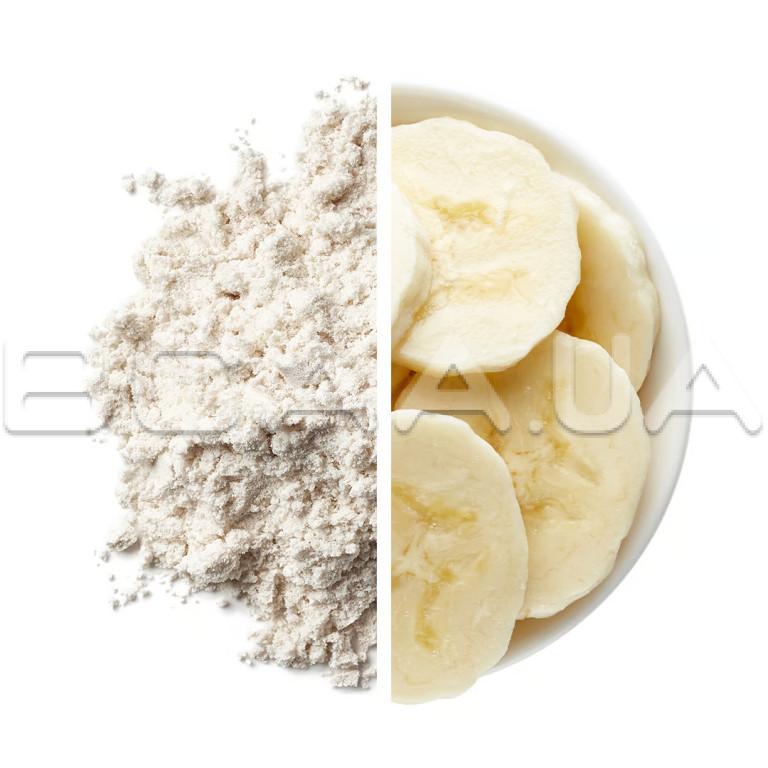- Вкус банана (Banana): 63 % концентрат сывороточного протеина, мальтодекстрин, глюкоза, фруктоза, изомальтулоза-палатиноза™ (источник фруктозы и глюкозы), пшеничная клетчатка (не содержит глютен), L-глютамин, L-лейцин, стабилизаторы акации и ксантановая камедь, ароматизатор, L-аргинина альфа-кетоглутарат, L-изолейцин, L-валин, таурин, антислеживатели фосфат кальция и диоксид кремния, премикс витаминов (L-аскорбиновая кислота, DL-α-токоферилацетат, никотинамид, D -пантотенат кальция, цианокобаламин, пиридоксина гидрохлорид, рибофлавин, мононитрат тиамина, фолиевая кислота, D-биотин), подсластители сукралоза и стевиоловые гликозиды, краситель бета-каротин. Продукт содержит аллерген лактозу.