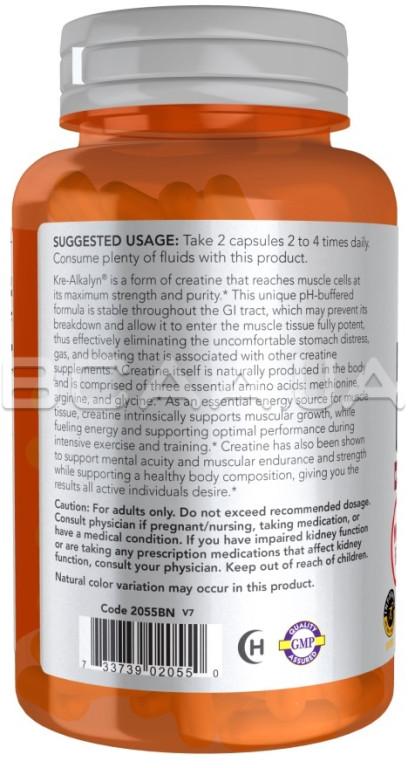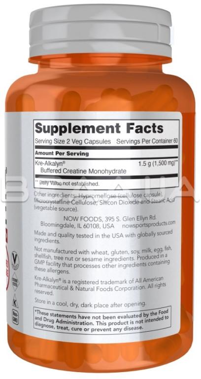 - Now Foods, Sports, Kre-Alkalyn Creatine 750 mg содержит запатентованную pH-буферизированную форму моногидрата креатина, разработанную для улучшенной стабильности, усвоения и производительности. Креатин — одна из самых исследованных спортивных добавок, доказано поддерживающая мышечную силу, взрывную мощь и выносливость во время тренировок — без необходимости фазы загрузки.