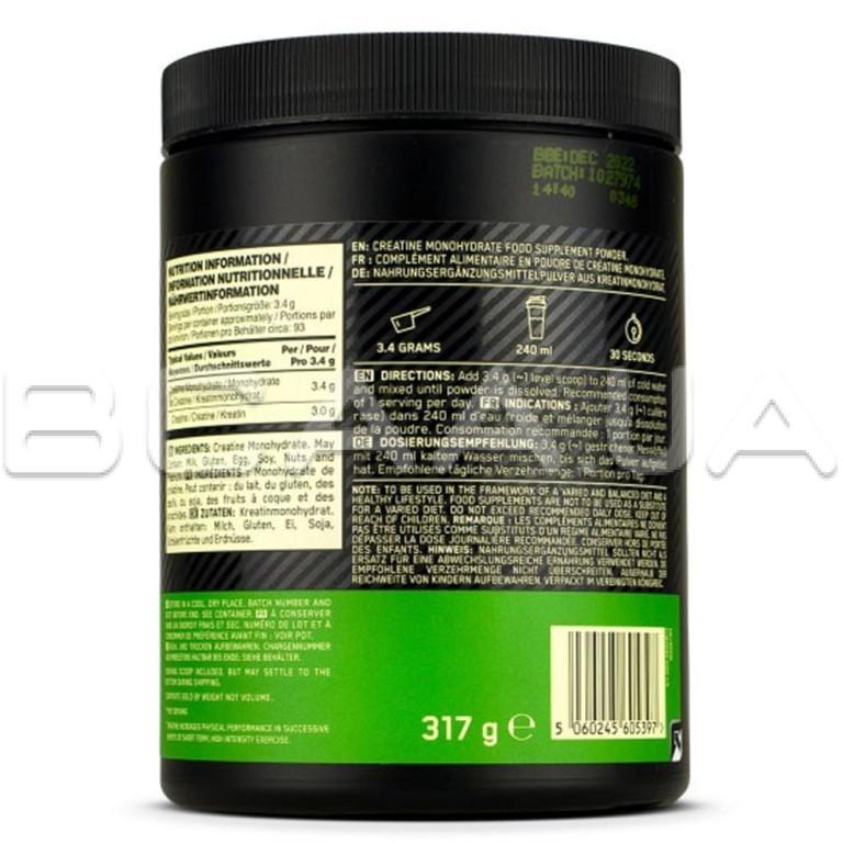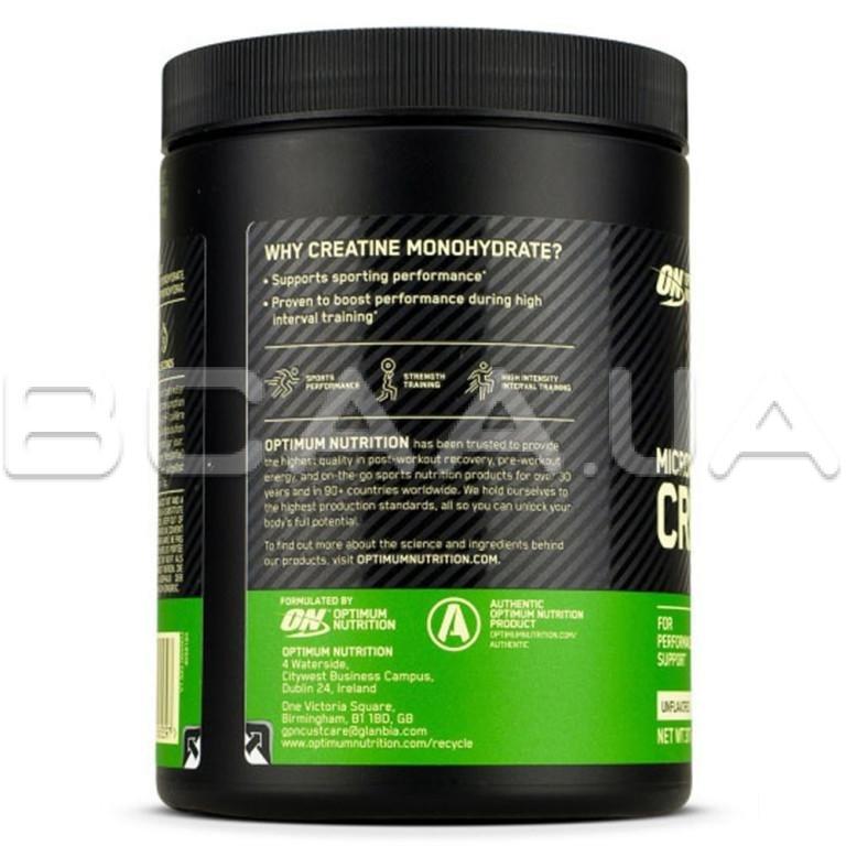- Креатин Optimum Nutrition производится из чистого моногидрата креатина, который является наиболее хорошо изученной формой креатина. Каждая порция содержит 3,4 грамма моногидрата креатина марки Creapure чистотой 99,9%. Прием креатина позволяет вам дольше поддерживать высокий уровень интенсивности при выполнении высокоинтенсивных упражнений. Креатин особенно эффективен если вы занимаетесь силовыми видами тренинга, также подходит для анаэробных видов спорта, такие как футбол или регби. Поскольку эта добавка не имеет вкуса, вы можете легко комбинировать креатиновый порошок с протеиновыми коктейлями, гейнерами и другими спортивными добавками.