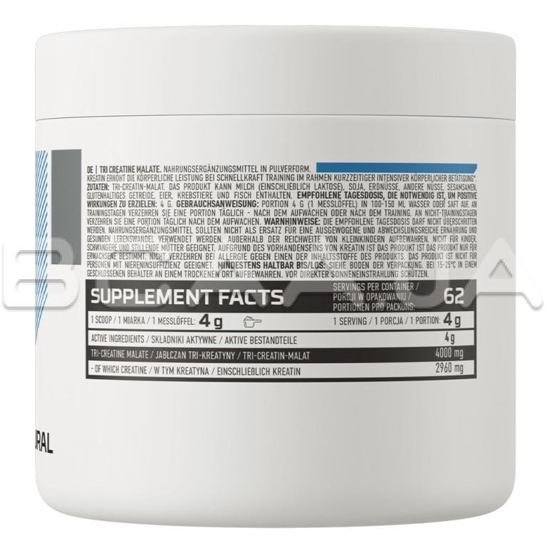 - Ostrovit, Tri Creatine Malate использует креатин малат, соединение молекулы креатина с яблочной кислотой в соотношении 1:3. Это одна из самых растворимых форм соединения, которая отличается высокой стабильностью и устойчивостью к желудочным ферментам, а также отличной усвояемостью в организме человека. Креатин малат в гораздо меньшей степени, чем моногидрат, способствует задержке воды в организме, что делает его очень популярным среди спортсменов разных дисциплин.