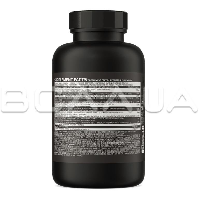 Ингредиенты: Магниевые соли лимонной кислоты (магний), экстракт семян пажитника (Trigonella foenum-graecum L.), наполнитель: гидроксипропилметилцеллюлоза, экстракт корня маки (Lepidium meyenii Walp.), D-аспарагиновая кислота (DAA), экстракт Tribulus terrestris (Tribulus terrestris L.), стандартизированный на 90% сапонинов, экстракт листьев крапивы (Urtica dioica), экстракт плодов пальметто (Serenoa repens (W. Bartram) Small), пиколинат цинка (цинк), экстракт корня женьшеня (Panax ginseng C.A. Meyer) стандартизированный по 20% гинзенозидов, экстракт плодов черного перца (Piper nigrum L.), стандартизированный по 95% пиперина, пиридоксаль-5'-фосфат (витамин В6), антислеживатель: магниевые соли жирных кислот.