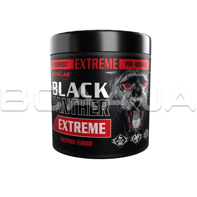 - Activlab, Black Panther Extreme — это многокомпонентная добавка, особенно рекомендуемая для использования перед силовыми тренировками и тренировками на выносливость, способствующая наращиванию так называемой сухой мышечной массы. Препарат содержит аминокислоты, витамины и минералы. Потребление креатина повышает физическую работоспособность во время кратковременных, повторяющихся, высокоинтенсивных упражнений. Бета-аланин за счет задержки наступления утомления позволяет продлить время тренировки. Кофеин помогает повысить выносливость и физическую работоспособность во время тренировки. Пантотеновая кислота помогает поддерживать умственную работоспособность на должном уровне.