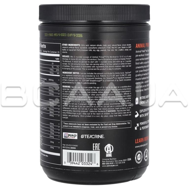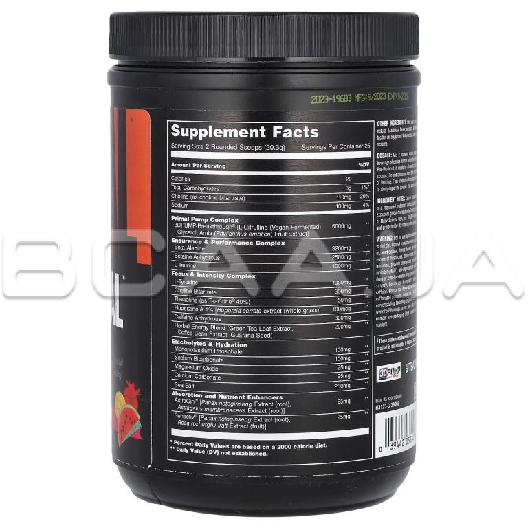 - Animal, Primal™ Loaded, Pre Workout — это предтренировочный комплекс, который разработан для поднятия уровня энергии, концентрации и выносливости, чтобы вы могли выдержать даже самые изнурительные тренировки. Кроме того, он способствует гидратации мышц с помощью необходимых электролитов.