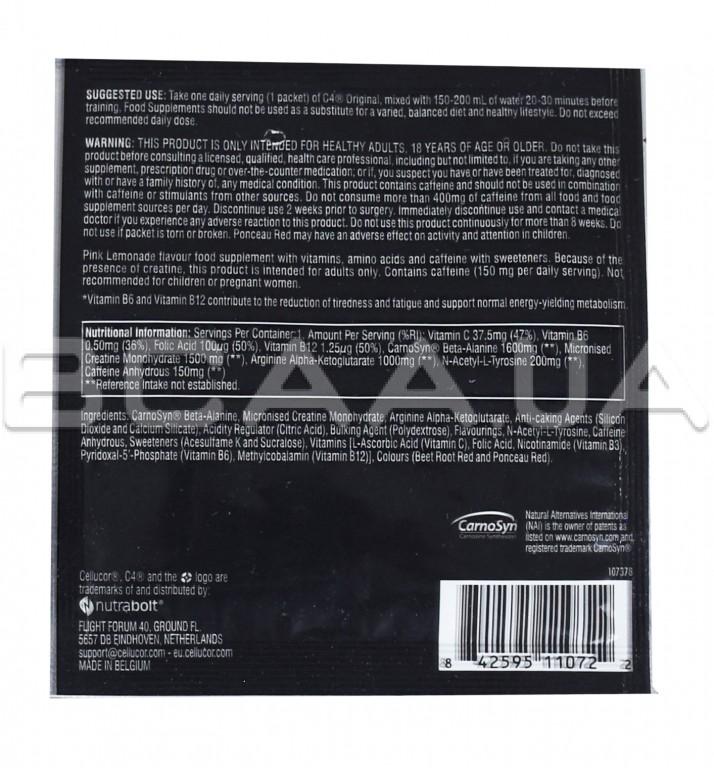 - C4 Original Pre Workout - это четвертое поколение С4-это следующий уровень инновационного предтренировочного комплекса. Его формула стала более мощной, и включает в себя уникальный ингредиент TeaCor ™ для улучшения энергии, которая приходит быстро и длится дольше.