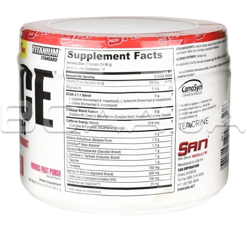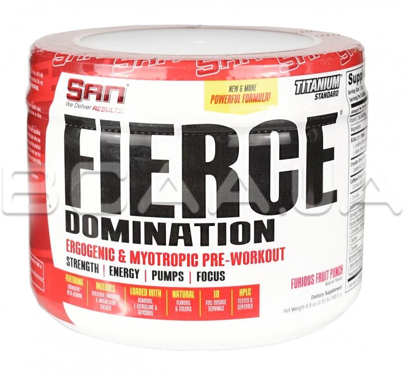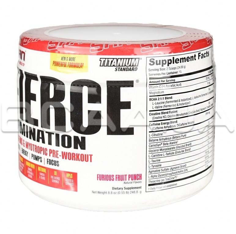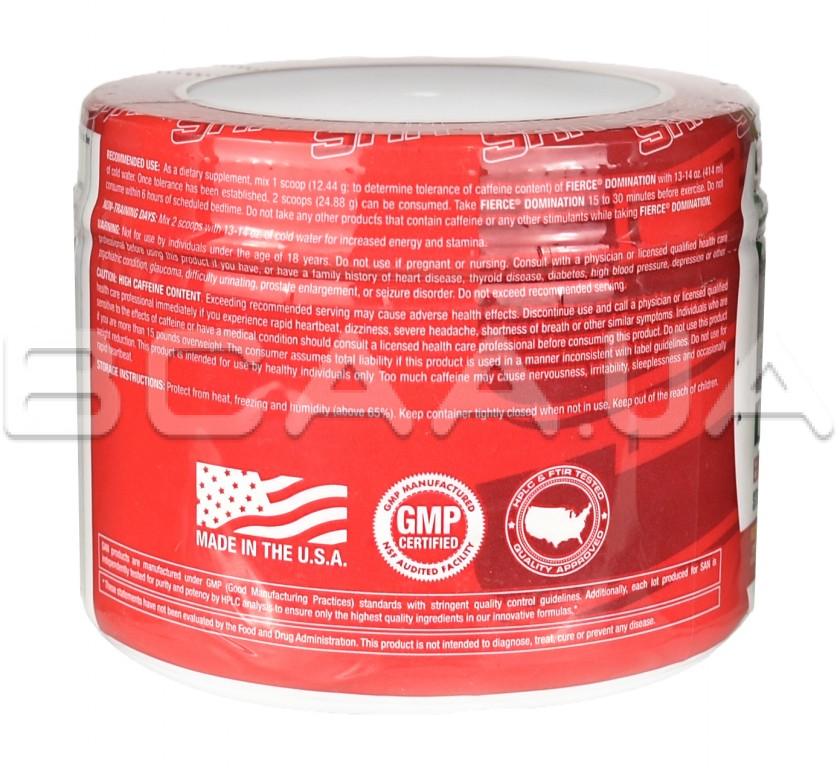 - Fierce Domination - предтренировочный комплекс отлично сбалансирован по составу. Креатиновая матрица увеличит концентрацию креатинфосфата в скелетной мускулатуре,ускорит восстановление АТФ,главного энергетического двигателя в организме.Бета-аланин нейтрализует ионы водорода,основных участников процесса повреждения мышц во время тренинга. Таурин повысит выносливость и улучшит деятельность головного мозга. L-аспарагиновая кислотапростимулирует работу центральной нервной системы, улучшит углеводный метаболизм.