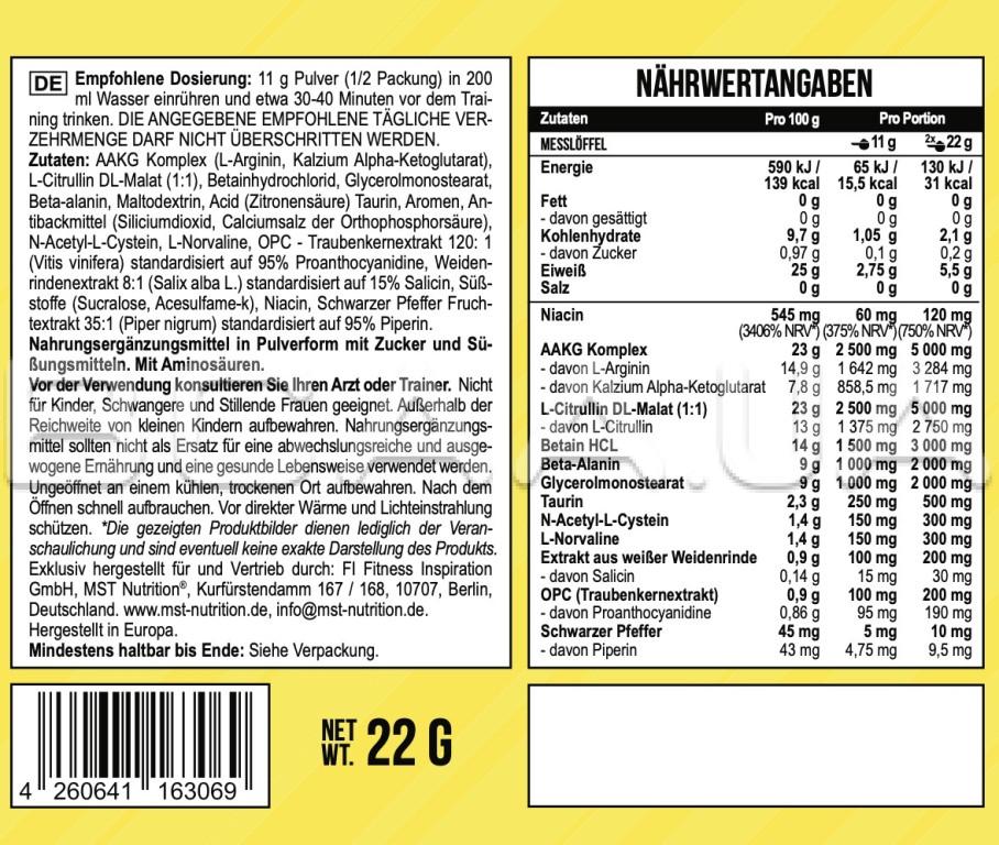 Другие ингредиенты: AAKG Complex (L-аргинин, альфа-кетоглутарат кальция), DL-малат L-цитруллина (1:1), гидрохлорид бетаина, моностеарат глицерина, бета-аланин, мальтодекстрин, кислота (лимонная кислота), таурин, ароматизаторы, диоксид кремния, соль фосфата кальция, N-ацетил-L-цистеин, L-норвалин, экстракт виноградных косточек 120:1 (Vitis vinifera), стандартизированный до 95% проантоцианидина, экстракт коры белой ивы, стандартизированный до салицина, подсластители (сукралоза, ацесульфам-К), ниацин, экстракт плодов черного перца 35:1 (Piper nigrum), стандартизированный до 95% пиперина.