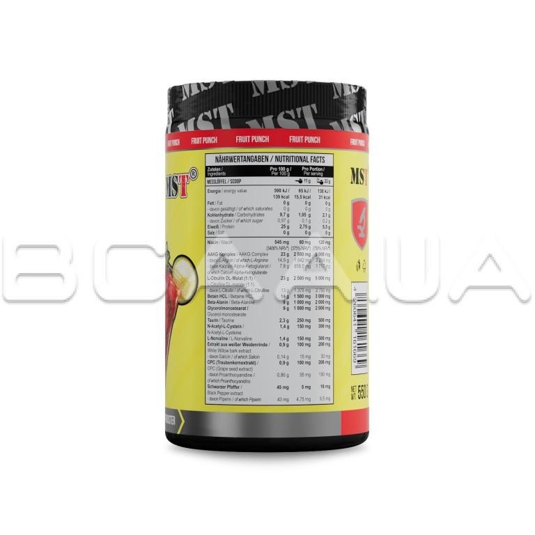 Другие ингредиенты: AAKG Complex (L-аргинин, альфа-кетоглутарат кальция), DL-малат L-цитруллина (1:1), гидрохлорид бетаина, моностеарат глицерина, бета-аланин, мальтодекстрин, кислота (лимонная кислота), таурин, ароматизаторы, диоксид кремния, соль фосфата кальция, N-ацетил-L-цистеин, L-норвалин, экстракт виноградных косточек 120:1 (Vitis vinifera), стандартизированный до 95% проантоцианидина, экстракт коры белой ивы, стандартизированный до салицина, подсластители (сукралоза, ацесульфам-К), ниацин, экстракт плодов черного перца 35:1 (Piper nigrum), стандартизированный до 95% пиперина.