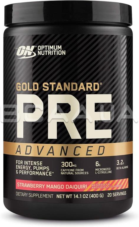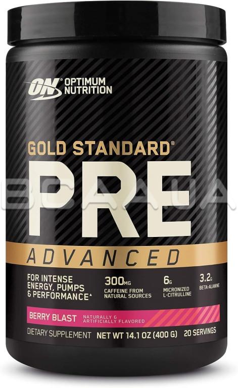- Gold Standard Pre Advanced от Optimum Nutrition — это новый уровень проверенных ингредиентов. Optimum Nutrition взяли все самое лучшее из предтренировочного комплекса Gold Standard Pre-Workout и улучшили оригинальную формулу, для повышения ее эффективности. Добавка повышает уровень энергии и концентрации, способствует притоку крови в мышечные волокна, а именно "пампингу", что в свою очередь позитивно влияет на результаты во время тренировок.