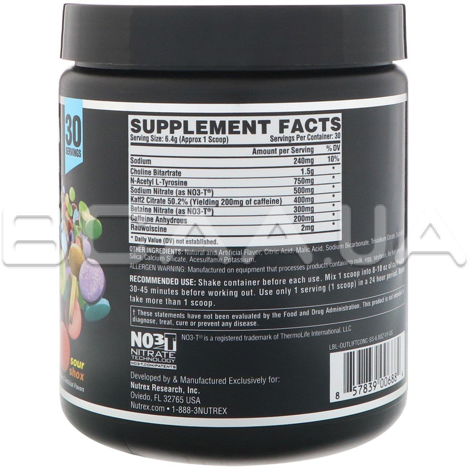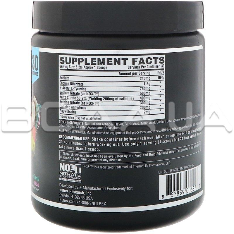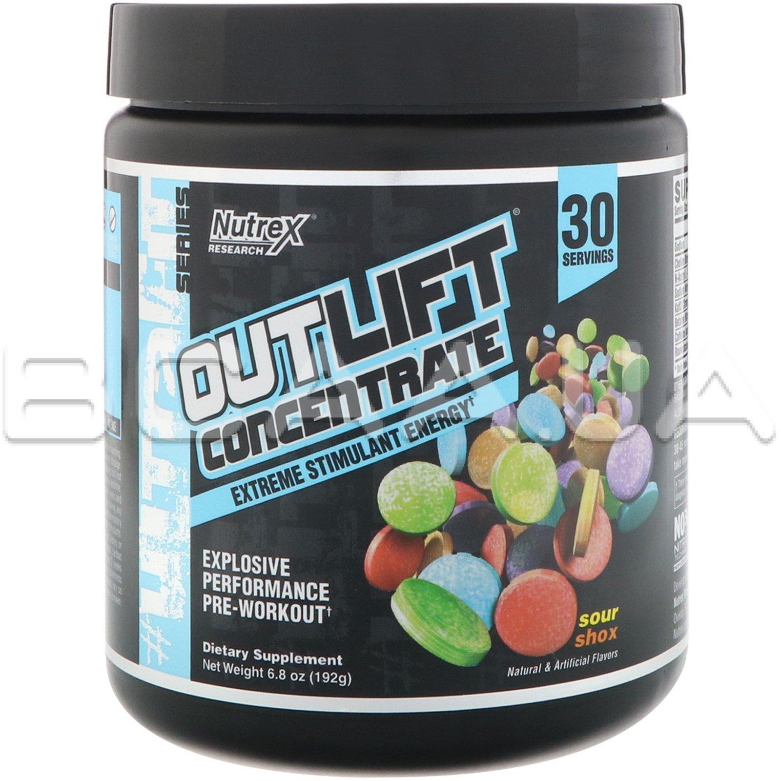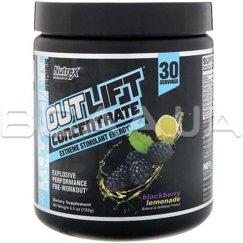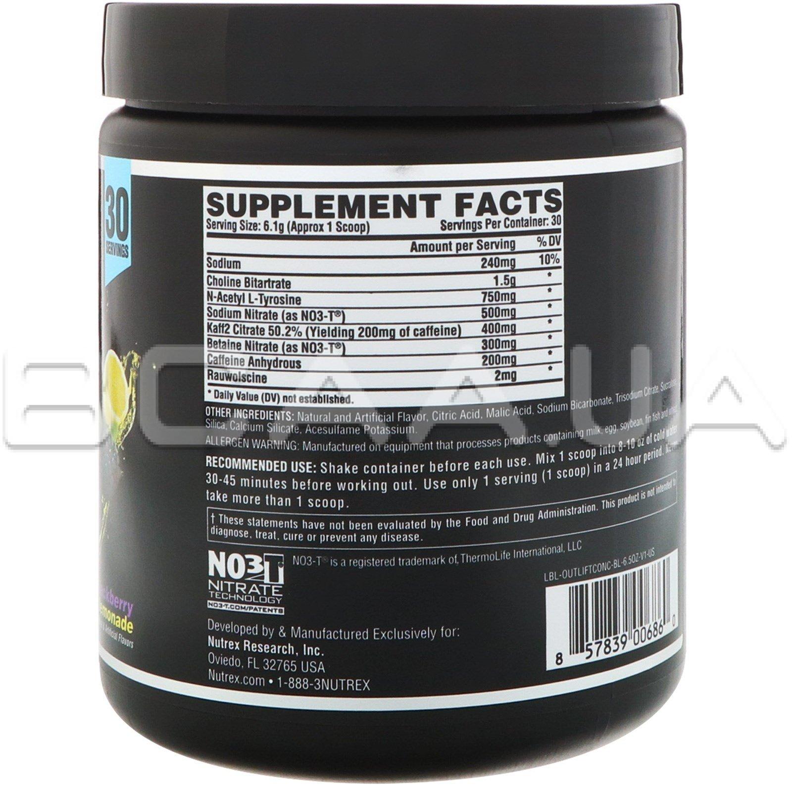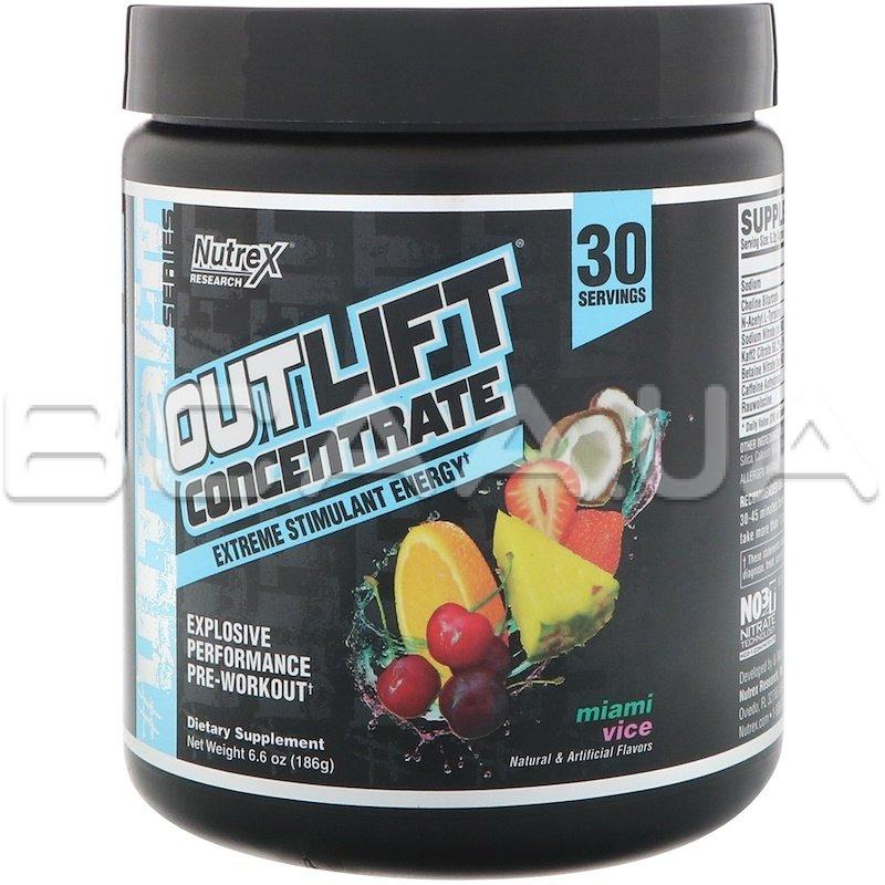 - OutLift Concentrat - формула вместилась в 6,2 г, этого хватит что бы вывести вас на следующий уровень тренировок ! В 2014 году Nutrex Research решила заняться выпуском OUTLIFT. Данный продукт был выпущен для тех, кто ищет клинически дозированные ингредиенты, и все еще ищет экстремальные уровни энергии стимуляторов. Сегодня мы стремимся предложить предтрен который предлагает технологию NO3-T® Nitrate, при использовании которой самые интенсивные тренировки покажутся Вам пустяком.