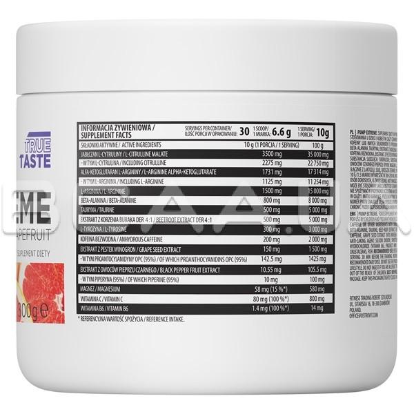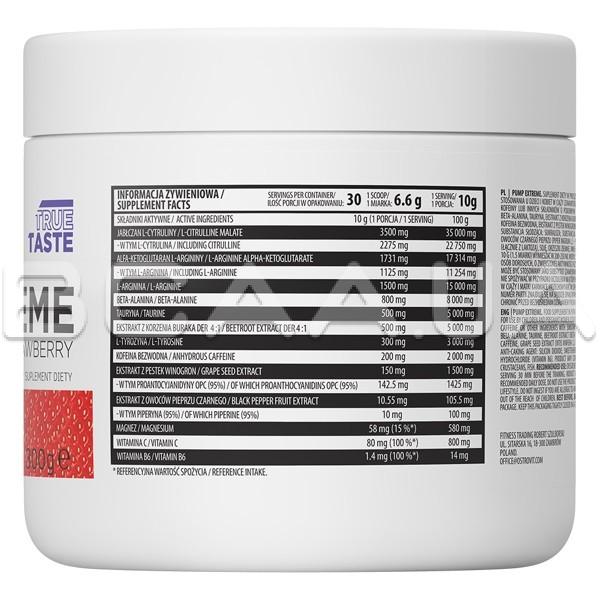 Ингредиенты: L-цитруллин малат, L-аргинин альфа-кетоглутарат, L-аргинин, бета-аланин, таурин, экстракт корня свеклы (Beta vulgaris L.) DER 4: 1, магниевые соли лимонной кислоты (магний), L-тирозин, кофеин безводный, экстракт виноградных косточек (Vitis vinferaL.) - 95% проантоцианидинов, ароматизатор, L-аскорбиновая кислота (витамин C), подсластитель: сукралоза; средство против слеживания: диоксид кремния; подсластитель: ацесульфам К; экстракт плодов черного перца (Piper nigrum L.) - 95% пиперина, концентрат порошка черной моркови, гидрохлорид пиридоксина (витамин B6).