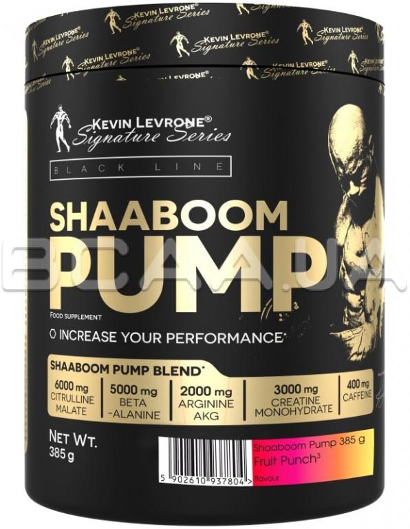- Shaaboom Pump – включает бета-аланин, цитруллин малат, агматин сульфат, кофеин и три вида креатина (креатин моногидрат, креатин гидрохлорид, трикреатин малат), сочетание которых способствует повышению энергетических ресурсов организма, увеличение мышечного роста и силовых показателей.