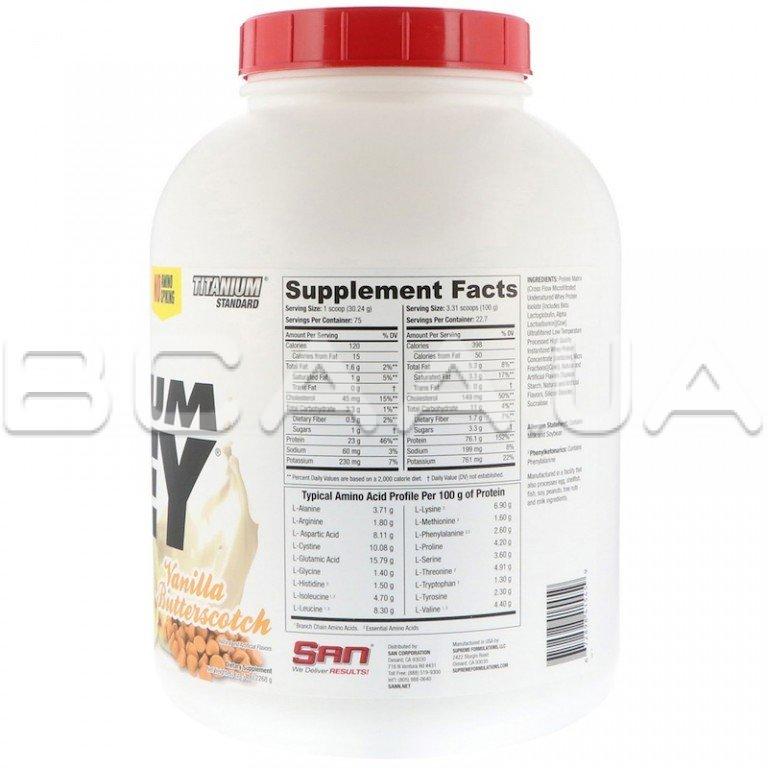- San, 100% Pure Titanium Whey Protein - протеин мощного действия, существенно усилен пептидами, BCAA, лактоглобулинами. Разгоняя до максимальных скоростей белковый синтез, он сбережёт ваш желудочно-кишечный тракт от неприятных ощущений. Практически свободный от различных примесей, он в максимально короткие временные рамки усваивается, восстанавливая повреждённые ткани, вызывая рост их объёмов.