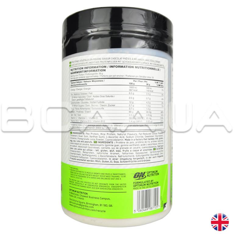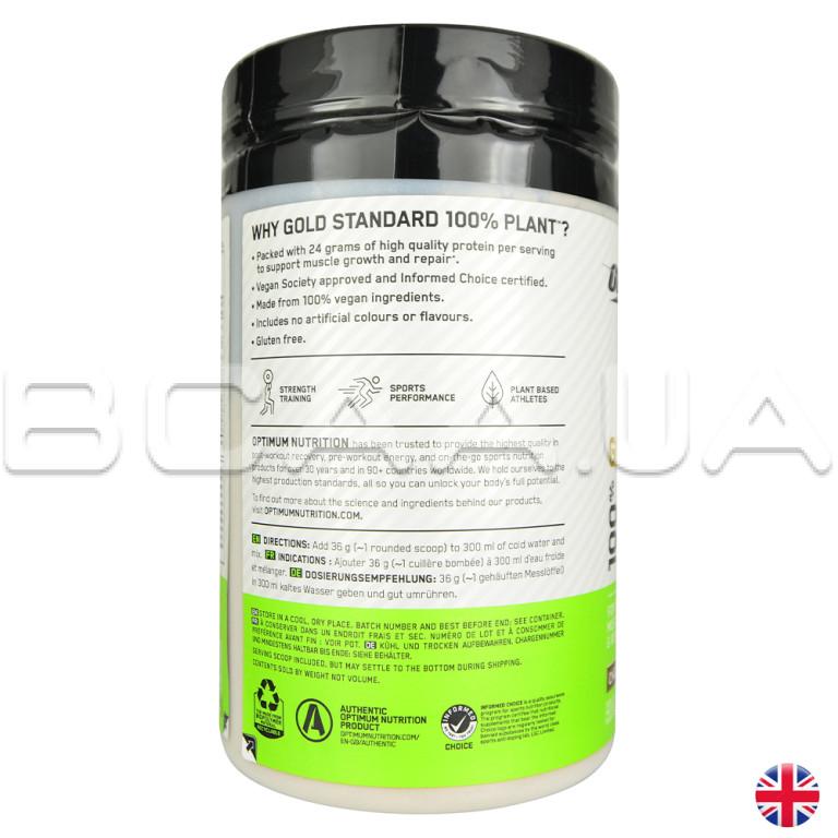 - Optimum Nutrition, Gold Standard 100% Plant Protein (UK) - это сочетание органических белков гороха, коричневого риса и сача инчи Наряду с 24 граммами белка каждая порция содержит дневную норму витамина С, витамин В12 и включает безглютеновый комплекс зерен и гранатового порошка. Продукт не содержит ГМО, искусственных красителей, ароматизаторов и подсластителей.