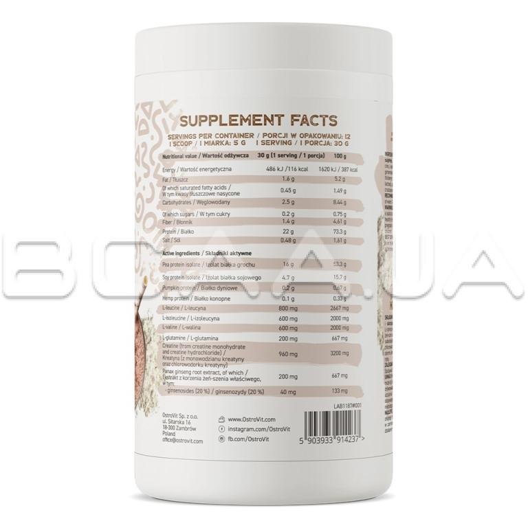 - Ostrovit, Vegan Muscle — это высококачественная пищевая добавка, предназначенная для физически активных людей, придерживающихся вегетарианской или веганской диеты. Является источником растительного белка, а также активных ингредиентов, таких как креатин, BCAA или экстракт корня женьшеня, которые отлично подойдут после тренировки.