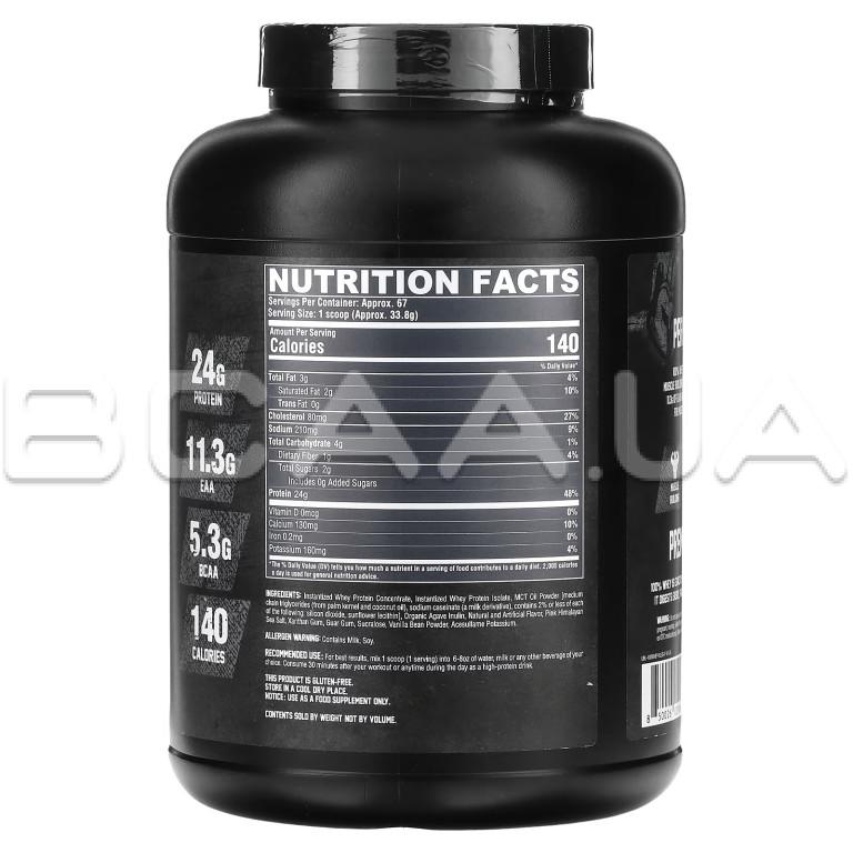Другие ингредиенты: Инстантизированный концентрат сывороточного белка, инстантизированный изолят сывороточного белка, порошок масла МСТ [триглицериды со средней длиной цепи (из пальмоядрового и кокосового масла), казеинат натрия (производное молока), содержит 2% или менее каждого из следующих веществ: диоксид кремния, лецитин подсолнечника], органический инулин агавы, натуральный и искусственный ароматизатор, розовая гималайская морская соль, ксантановая камедь, гуаровая камедь, сукралоза, порошок ванильных бобов, ацесульфам калия.