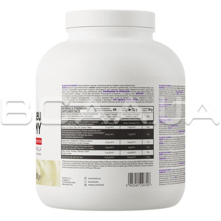 - Ostrovit, WPC 80.eu Economy - производится методом ультрафильтрации сывороточного концентрата, путем удаления существенных небелковых компонентов из пастерилизованной сыворотки, благодаря чему достигается его высокая очистка и максимальная биологическая ценность. Готовый продукт содержит свыше 80% белка. Сывороточный белок расценивается как наиболее полноценный вид протеина, содержащий все необходимые аминокислоты незаменимого типа. Быстрое и полное усвоение позволяет принимать протеин после физических нагрузок, что дает не только ускорение мышечного роста, но и восстановление мышечных тканей между тренировками. Кроме того, прием сывороточного протеина идеален для тех, кто хочет избавиться от лишнего жира, так как данный вид протеина обладает способностями жиросжигателя.