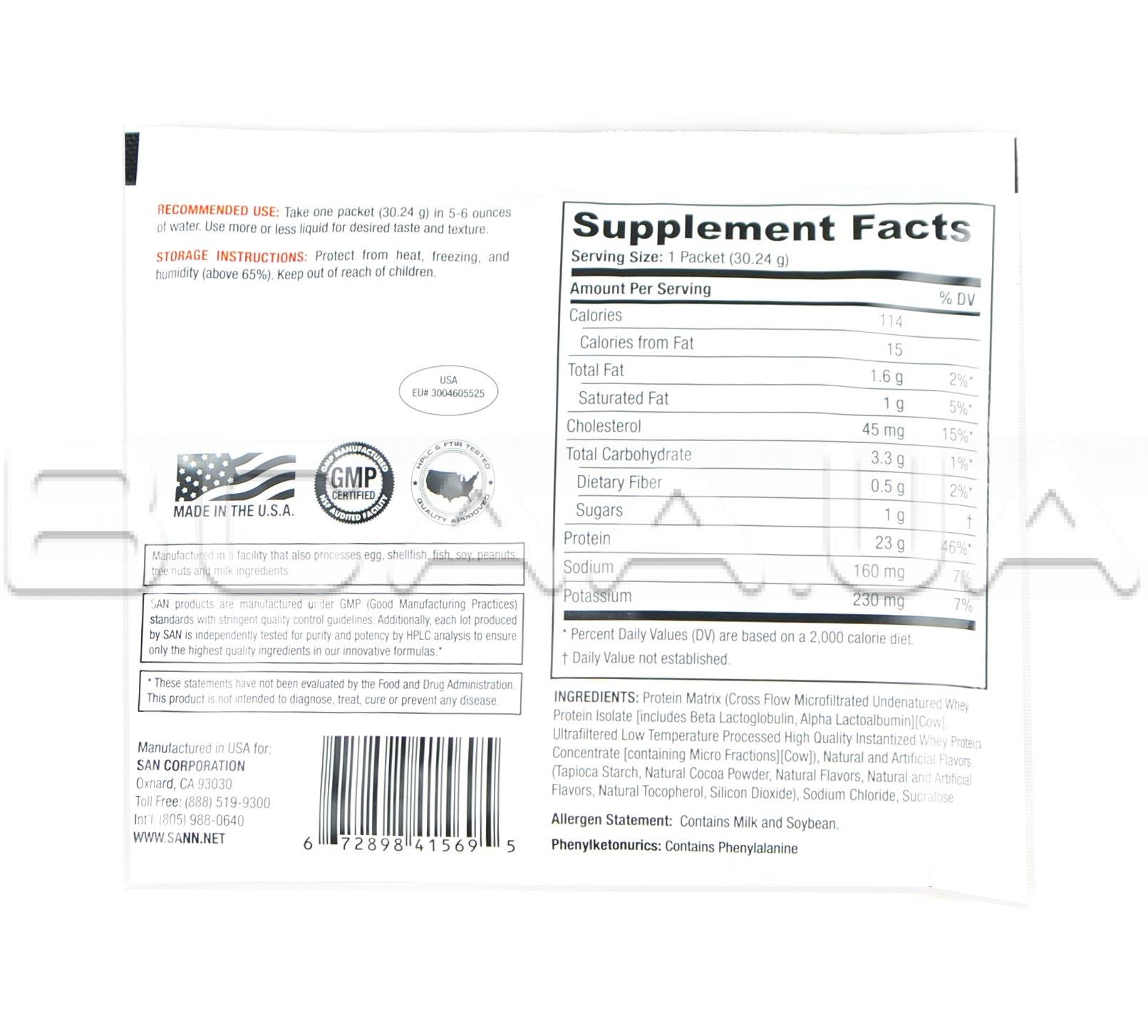 - San, 100% Pure Titanium Whey Protein - это ультра-фильтрованный молочный и сывороточный протеин, низкотемпературной обработки (включает бета лактоглобулин, альфа лактоглобулин), натуральные ароматизаторы (какао порошок, мальтодекстрин, декстроза), хлорид натрия, сукралоза.
