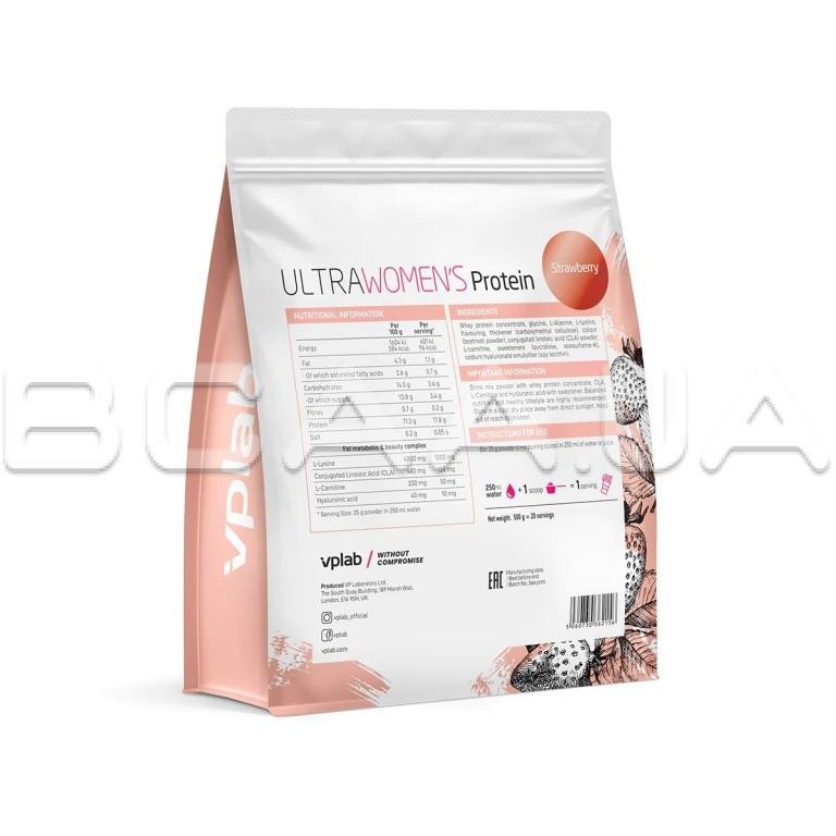 - VPLab, Ultra Women's Protein состоит в основном из концентрата сывороточного протеина, который является одним из лучших протеинов для женщин В связи с тем, что белок является основным строительным элементом мышц, настоятельно рекомендуется принимать протеин после тренировки или после физической нагрузки для обеспечения мышц белком, а также для защиты мышц от катаболических процессов. Этот вкусный и полезный протеиновый коктейль можно также использовать в любое время дня между основными приемами пищи. Добавка не содержит добавленного сахара и содержит мало жира и обогащена L-лизином, CLA, L-карнитином и гиалуроновой кислотой, которые оказывают положительное влияние на процесс похудения и поддержание здоровья кожи, волос и ногтей.