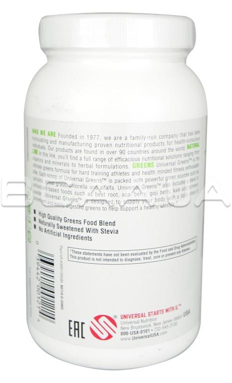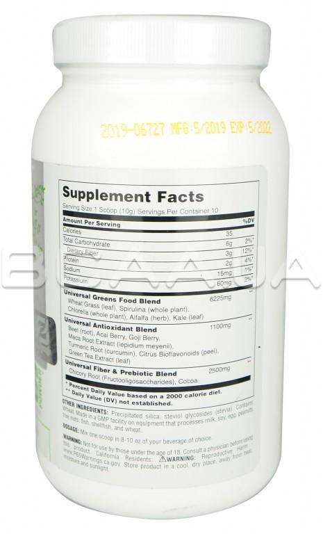 - Universal Greens Powder - это добавка, которая содержит мощные зеленые источники и антиоксиданты такие как спирулина, трава пшеницы, хлорелла и люцерна. Данный продукт также включает смесь продуктов на основе антиоксидантов, таких как корень свеклы, ягода Асаи, ягода годжи и порошка куркумы.