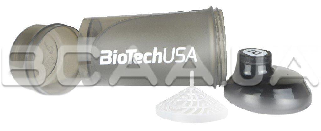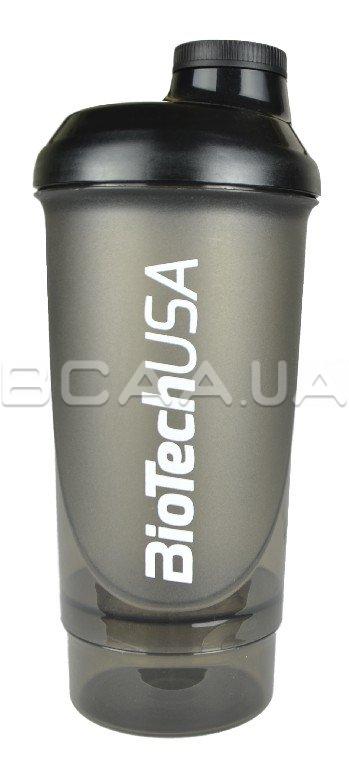 Compact Shaker - стильний та компактний шейкер. З легкістю допоможе змішати відразу кілька різних компонентів. Дана модель, збирається з чотирьох частин: основний контейнер на 500 мл (в ньому ви змішуватимете сам коктейль), додатковий відсік на 150 мл (підійде для зберігання таблеток, або невеликого перекушування), кришка зі зручною шийкою, а також сітчастий фільтр для змішування. Його можна взяти як у спортзал, так і в дорогу, адже щільно закрита кришка, не дозволить вашому вмісту розхлюпатися. До того ж у контейнера досить стильний дизайн, з логотипом популярної фірми Biotech USA.