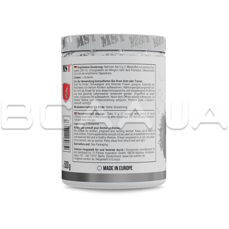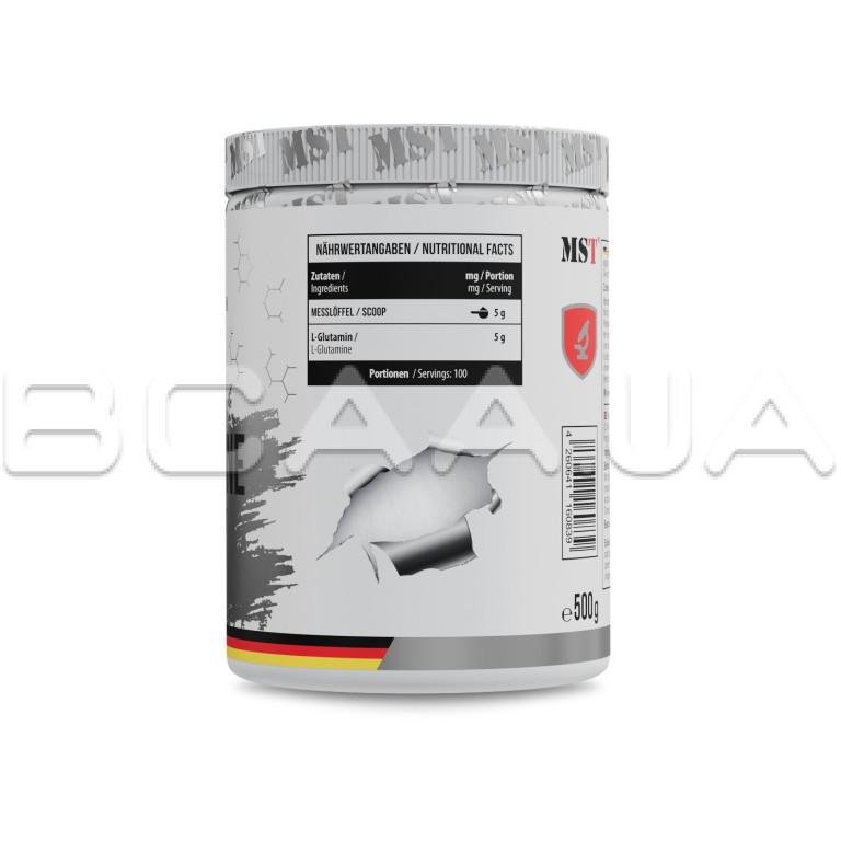 - MST, L-Glutamine - це порошкова харчова добавка, розроблена для підтримки відновлення м'язів, імунної функції та здоров'я кишечника. L-глютамін - умовно незамінна амінокислота, хоча організм може її виробляти, додатковий прийом може бути корисним у періоди інтенсивного фізичного стресу або хвороби.