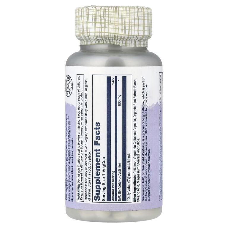 - Solaray, NAC, N-Acetyl-L-Cysteine 600 mg містить 600 мг N-ацетил-L-цистеїну (NAC) у кожній капсулі для підтримки антиоксидантного захисту, здоров'я печінки та функції дихальної системи. NAC – це стабільна форма амінокислоти цистеїну та ключовий попередник глутатіону, одного з найважливіших антиоксидантів організму. Ця формула, що підходить для веганів, ідеально підходить для щоденної підтримки здоров'я, детоксикації та зміцнення імунітету.