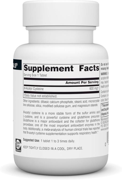 - Source Naturals, N-Acetyl Cysteine 600 mg містить високу дозу 600 мг NAC, стабільної та біодоступної форми амінокислоти цистеїну. NAC найбільш відомий як попередник глутатіону, одного з найважливіших антиоксидантів організму. Ця добавка розроблена для підтримки здоров'я печінки, антиоксидантного захисту, імунної функції та здоров'я дихальної системи, що робить її чудовим вибором для щоденної підтримки клітинного балансу та детоксикації.