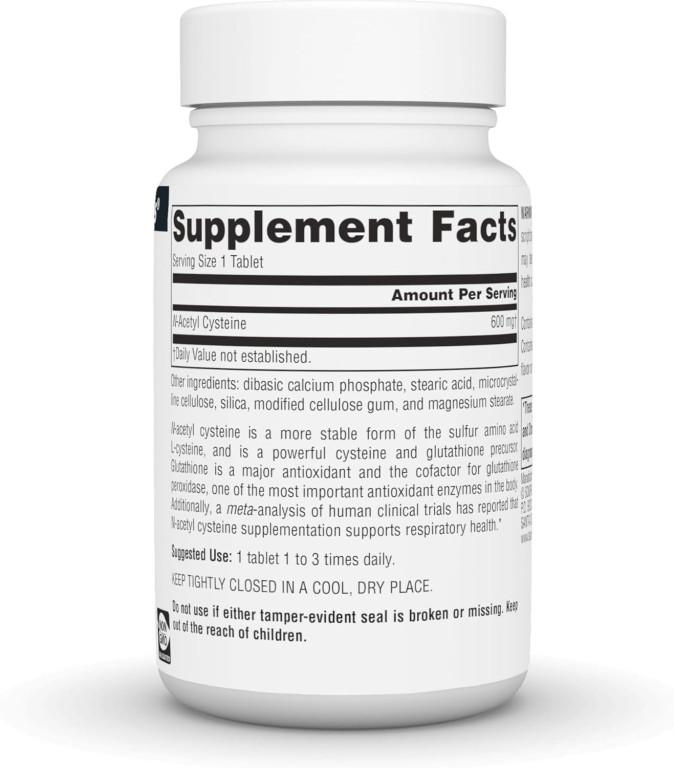 - Source Naturals, N-Acetyl Cysteine 600 mg містить високу дозу 600 мг NAC, стабільної та біодоступної форми амінокислоти цистеїну. NAC найбільш відомий як попередник глутатіону, одного з найважливіших антиоксидантів організму. Ця добавка розроблена для підтримки здоров'я печінки, антиоксидантного захисту, імунної функції та здоров'я дихальної системи, що робить її чудовим вибором для щоденної підтримки клітинного балансу та детоксикації.