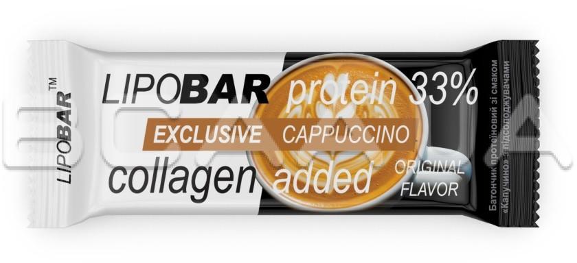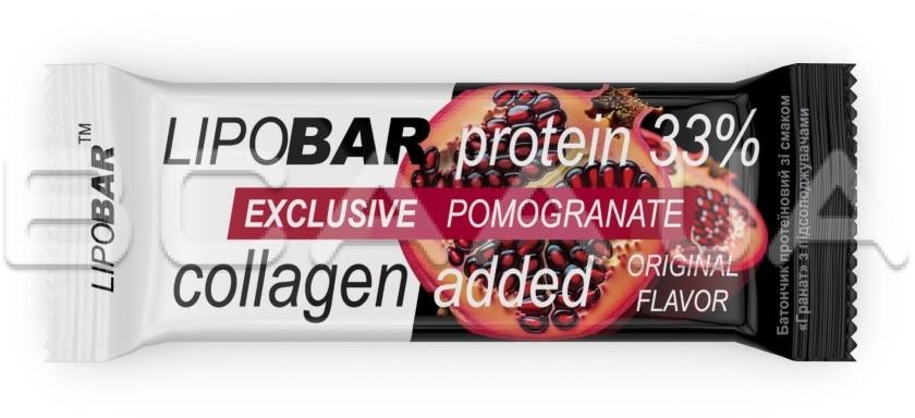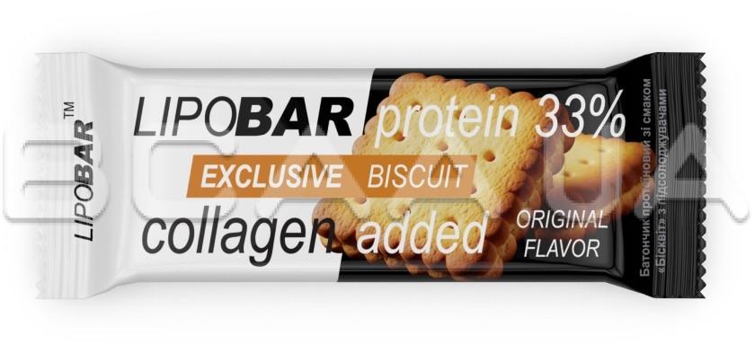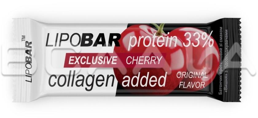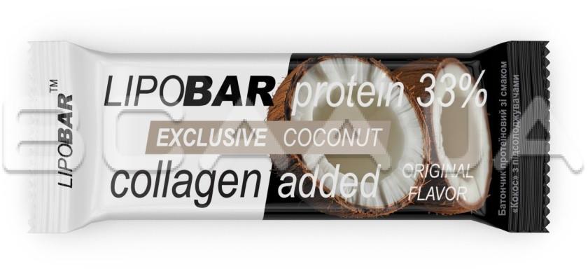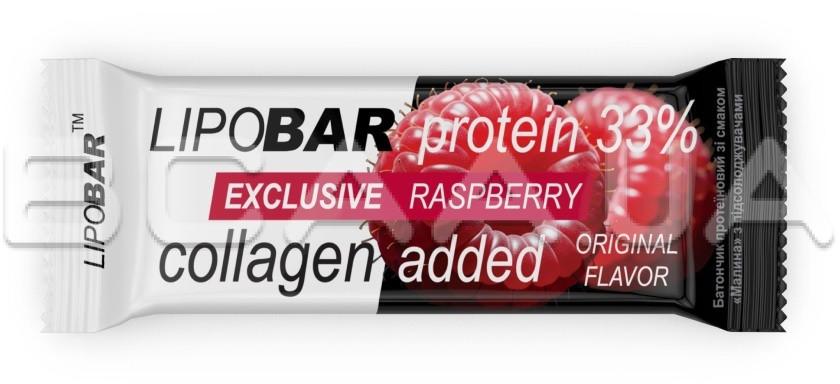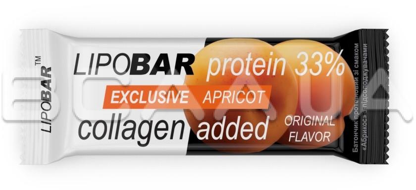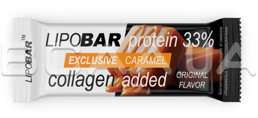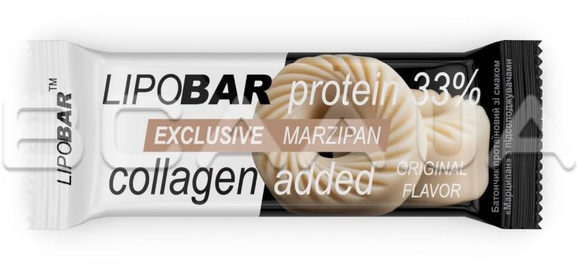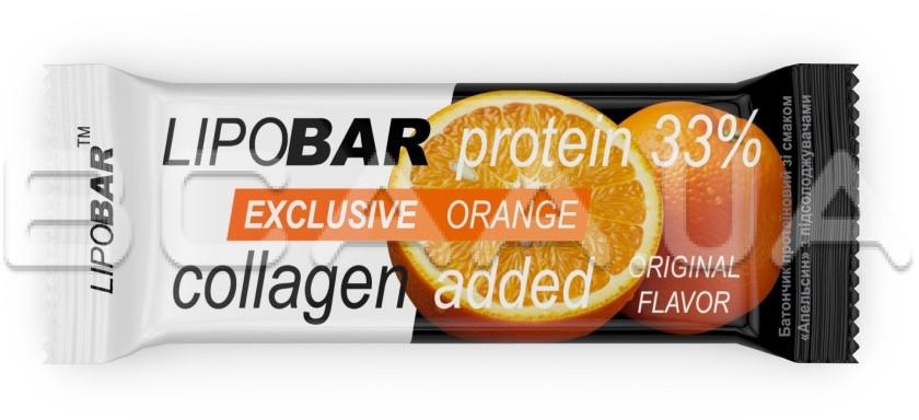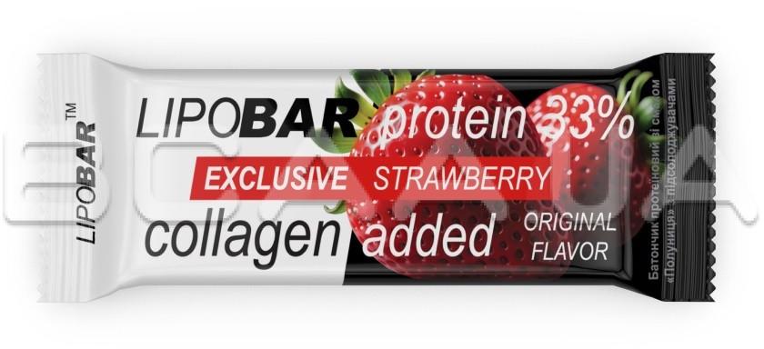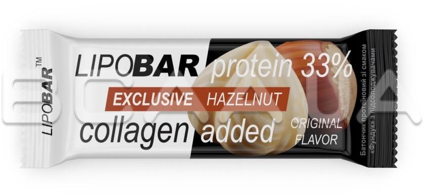 - Колаген Peptan® — науково доведена ефективність. Кожен Lipobar Exclusive містить 10–14% гідролізату колагену Peptan® (5–7 г у батончику).