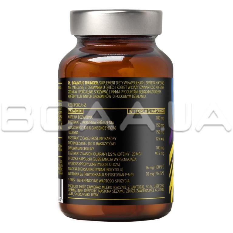 - Ostrovit, Braintus Thunder – це комплексна харчова добавка, яка є джерелом восьми різних активних сполук, включаючи таурин, кофеїн та екстракт насіння гуарани у формі капсул.