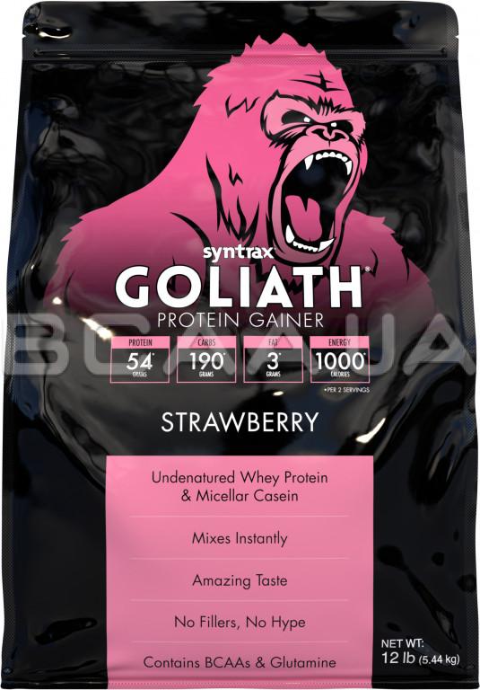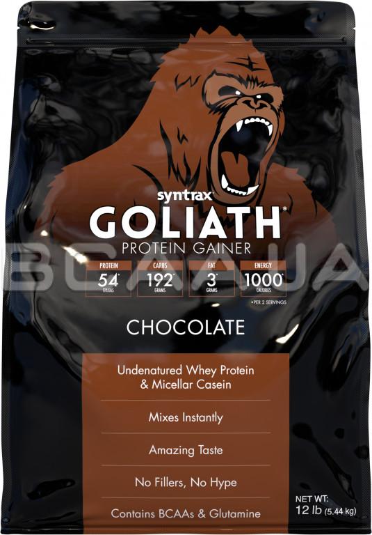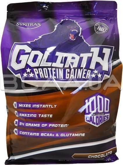 - Syntrax Goliath Protein Gainer - містить 192 гр вуглеводів, 54 гр протеїну і 1000 ккал на кожні два скупа, що виділяє його на тлі пересічних "творінь" інших виробників. Не забули в Syntrax і про BCAA і глютамін. "Голіаф" - це збалансований шедевр, який несе в собі відновлення і зростання м'язів.