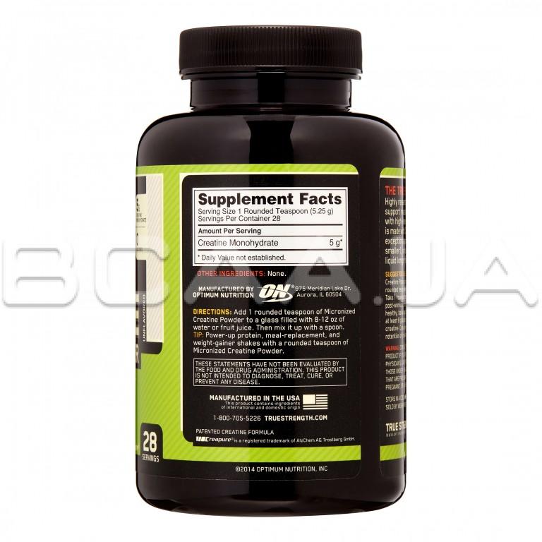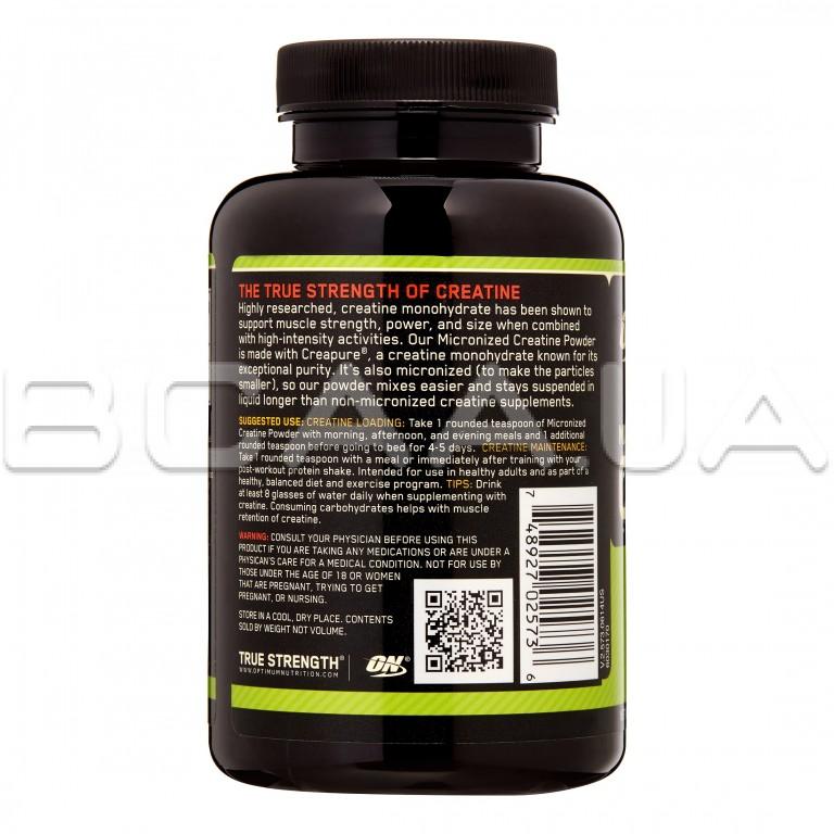 Креатин необхідний спортсменам для отримання додаткової енергії, що здатна в рази збільшити продуктивність під час тренувань, а також активізує приріст м'язової маси. Однією з популярних і ефективних біодобавок вважається Micronized Creatine Powder від американського виробника Optimum Nutrition. Основним компонентом препарату виступає креатин моногідрат, який забезпечує організм атлета додатковою енергією і робить його більш витривалим. Регулярний прийом даної добавки дає можливість помітити перші результати вже через тиждень, що важливо для тих, хто поставив для себе високі цілі в спорті. Також важливо відзначити, що після припинення прийому силові показники не падають, так як спортивне харчування не має в складі стероїдів. Це ще раз підтверджує його безпеку і високу ефективність для атлета.
