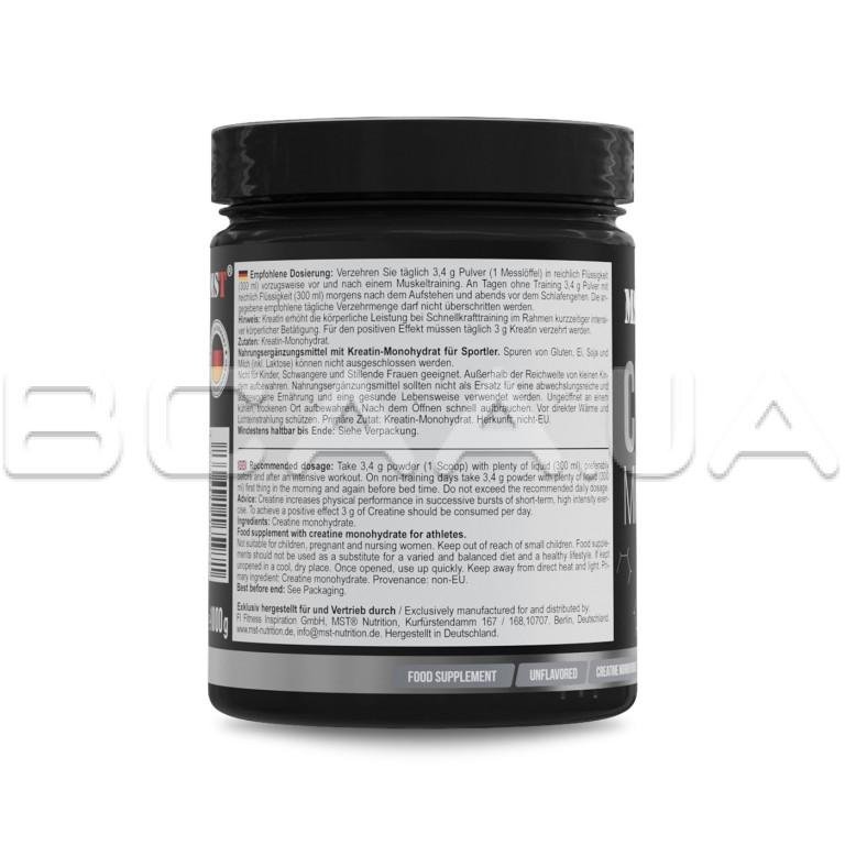 - MST, Creatine Micronized - це високоякісна мікронізована добавка моногідрату креатину, призначена для підвищення сили, підтримки росту м'язів та покращення результатів тренувань. Її мікронізована форма забезпечує швидке засвоєння та оптимальну біодоступність, що робить її чудовим доповненням до дієти спортсменів та любителів фітнесу на всіх рівнях.